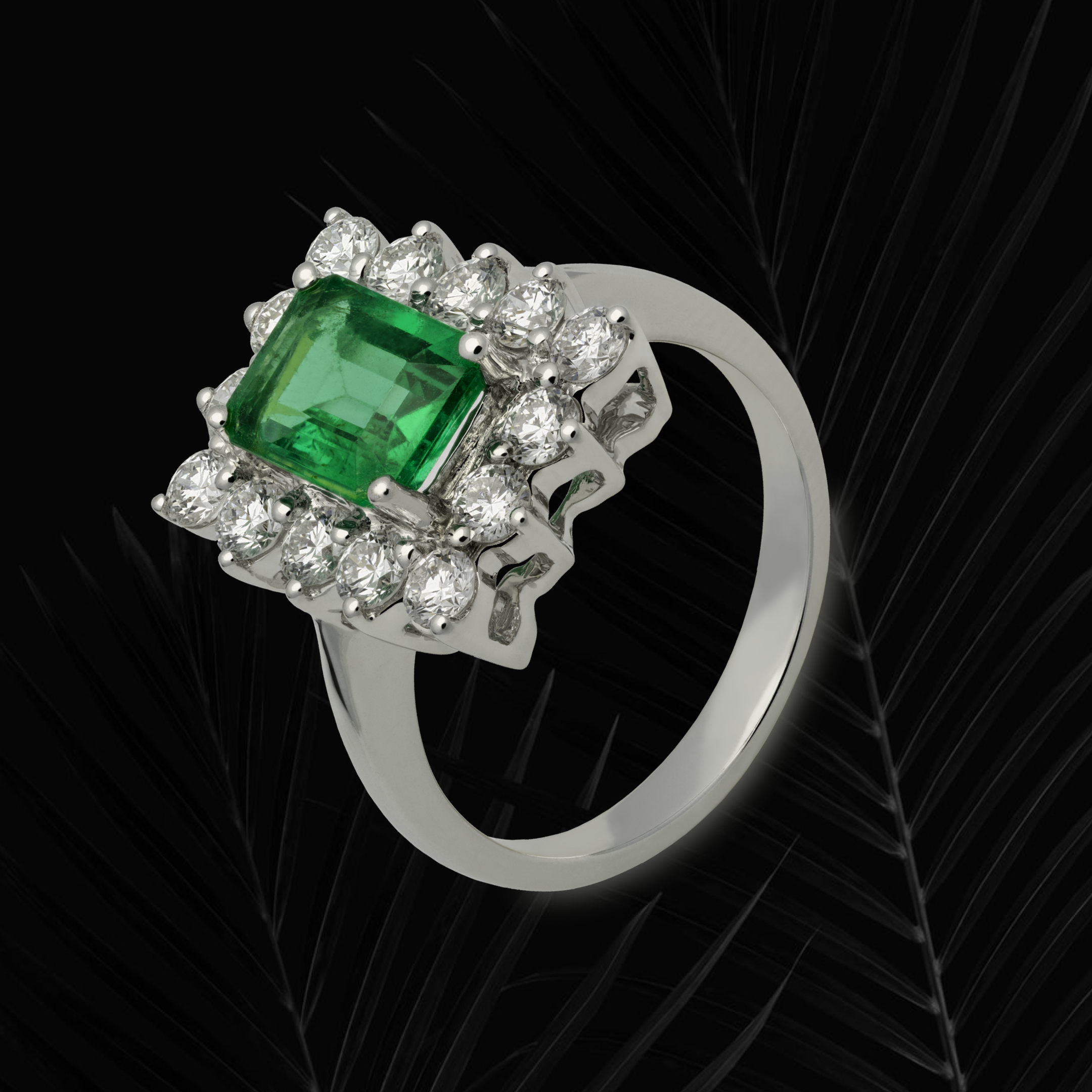 A white gold ring surrounding with stones with a glorious emerald in centre.